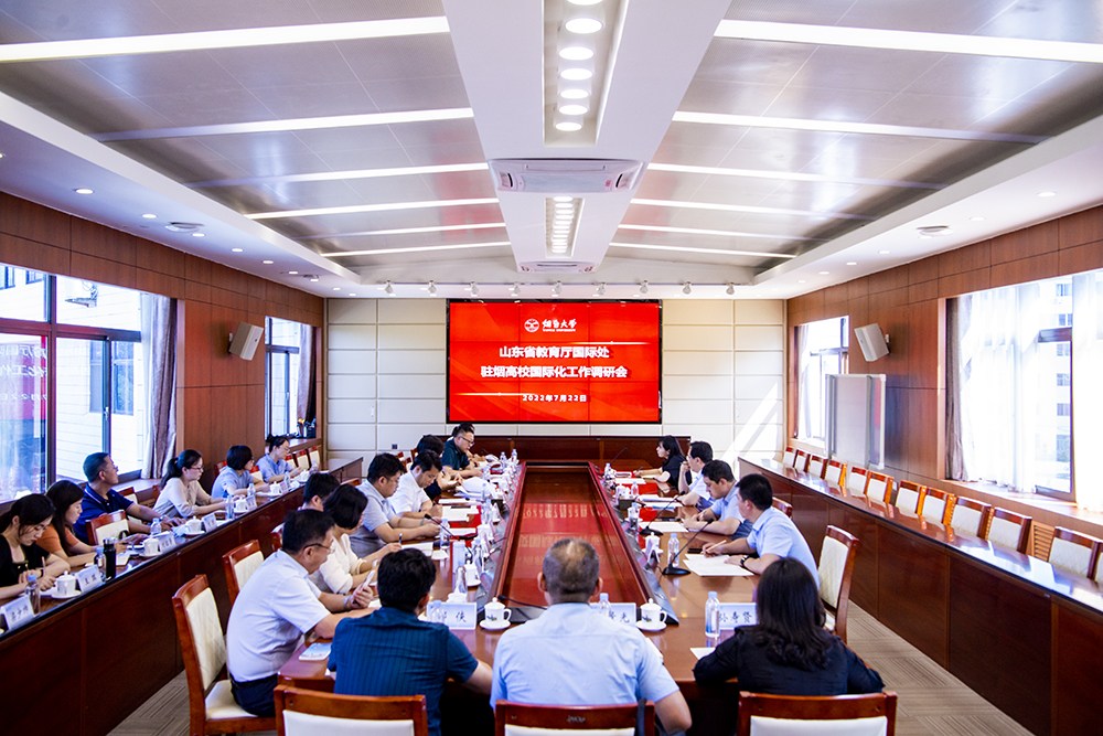 【本站讯】为推进新时期山东省教育国际交流工作高质量发展,7月22日,山东省教育厅国际处王夫海处长一行来校,就驻烟高校的高等教育国际化工作进行调研并举行座谈。sunbet申搏官方网站党委副书记、校长段培永,党委常委、副校长宋中民,国际合作交流处全体人员参加活动。