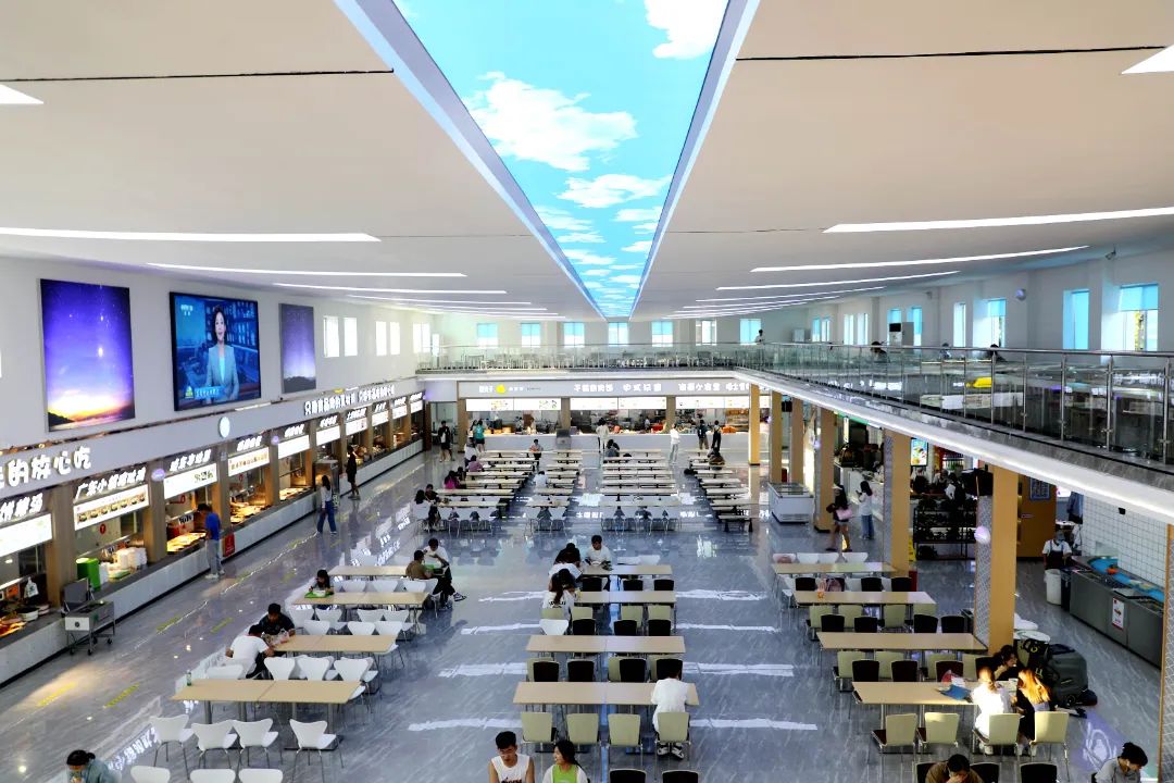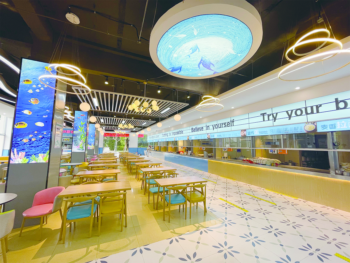 在餐厅装修方面,三个餐厅分别以白、蓝、中性色为餐厅装修主色调,色彩明媚亮丽。餐厅内新增空调,室内温度适宜,为师生们带来更丰富的就餐体验。后厨全部进行重新改造装修,每个操作间加装了甲级防火门,安装了自动报警装置,食品安全、消防安全保障全新升级。