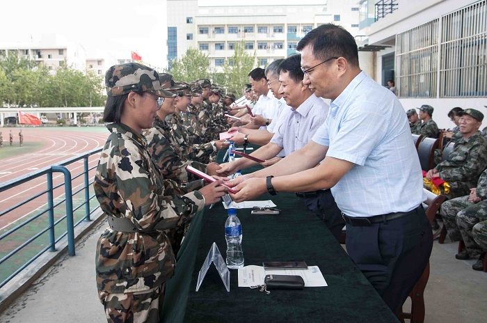 党委书记张伟向承训部队赠送锦旗,感谢部队官兵为军训工作付出的辛勤劳动。校长郭善利为2019级新生军训团颁奖,对今年军训工作取得的优异成绩给予肯定。副校长孙祥斌宣读《sunbet申搏官方网站关于表彰2019级学生军训先进集体及个人的决定》。学校对机电汽车工程学院、计算机与控制工程学院、经济管理学院、光电信息科学技术学院、海洋学院、土木工程学院、人文学院、外国语学院等8个“军训先进学院”以及10个“分列式优胜方队”、6个“歌咏比赛优胜队”、19个“会操优胜排”、27个“内务优胜班”、165名“优秀学员”和20名“优秀教官”进行了表彰。优秀学员代表方浩羽、优秀教官代表李明阳先后发言。