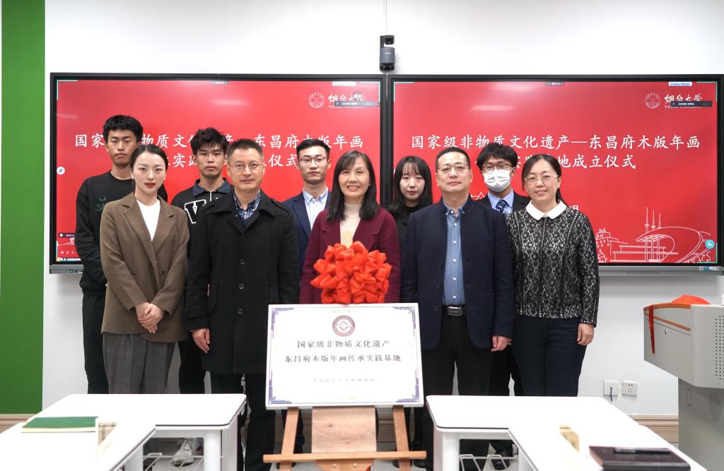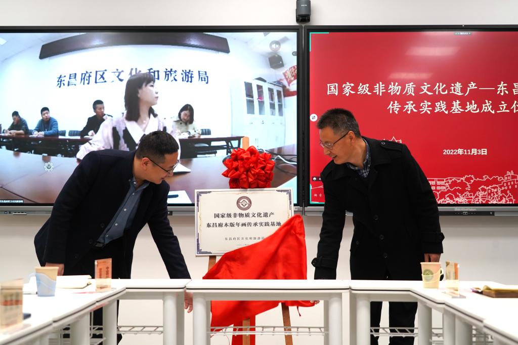 随后,刘超和张西俊共同为国家级非物质文化遗产东昌府木版年画传承实践基地揭牌。