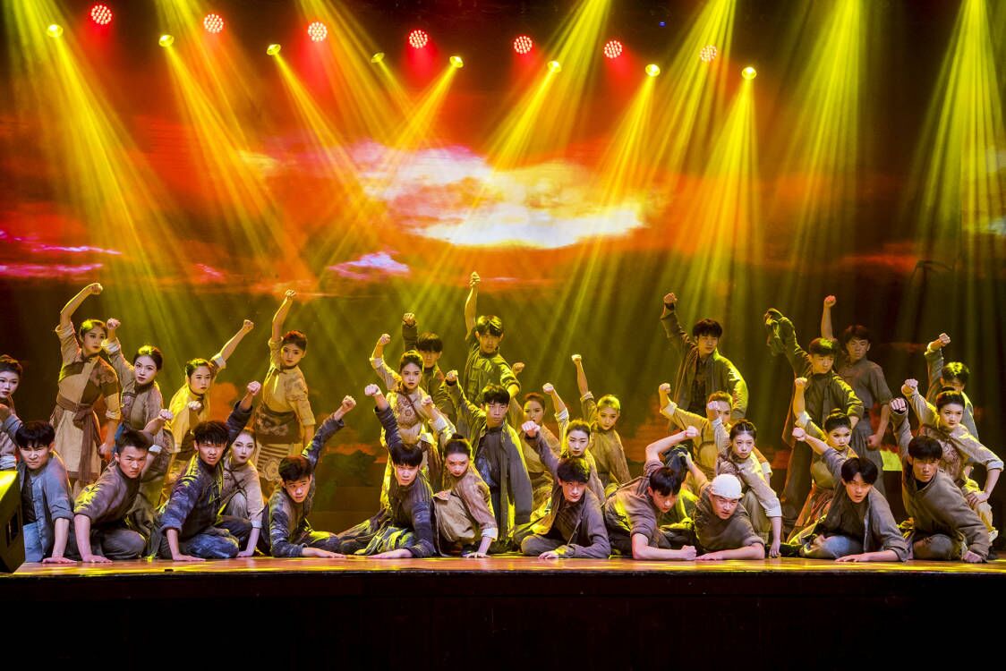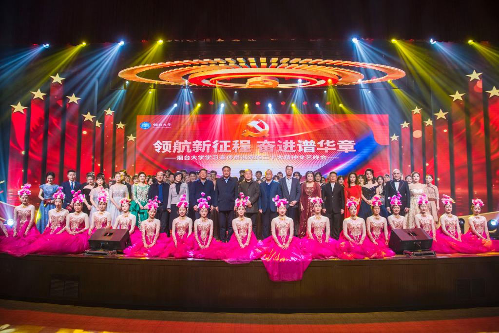 第三篇章中,男高音独唱《祖国万岁》高亢嘹亮,赞美祖国慈祥母亲,歌唱祖国万岁。民乐合奏《象王行》雄浑震撼,鼓点密集,带领观众共同感受中华传统文化之美。歌曲《把一切献给党》唱出人们对党忠诚不渝,对信仰矢志不移,甘愿为了理想奉献青春、奉献生命的坚定信念和满腔豪情。舞剧《地雷战》深情讴歌了齐鲁儿女在中国共产党领导下的不屈斗志与家国情怀,鼓舞广大师生赓续红色血脉。“伟大的中国共产党!乘风破浪,扬帆远航,领航中国在新时代的征程上……”高亢激昂的《领航》歌声响起,带领全场观众走过中国共产党百年光辉历程,唱响领航新征程、奋进谱华章的主旋律。