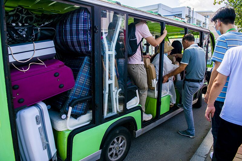 报到现场,校园巴士“小绿”隆重登场。完成报到手续后,新生可在志愿者及相关工作人员的帮助和引导下,乘坐绿色校园巴士前往宿舍,大大减轻了新生携带行李回宿舍的负担。