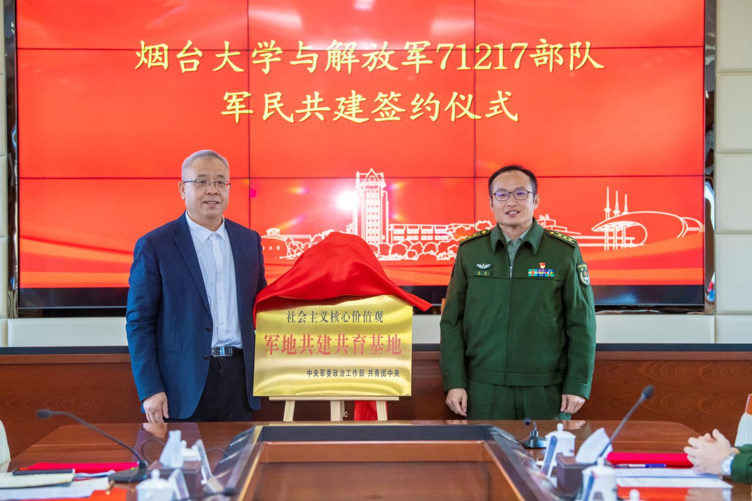 仪式上,71217部队政治工作部上校主任孔勇和校团委书记刘超分别代表军地双方签署了共建共育协议。71217部队政治工作部上校主任孔勇和sunbet申搏官方网站党委常委、副校长毕可志共同为“社会主义核心价值观军地共建共育基地”揭牌,毕可志代表学校向部队赠送“全国大学生社会实践基地”牌匾。