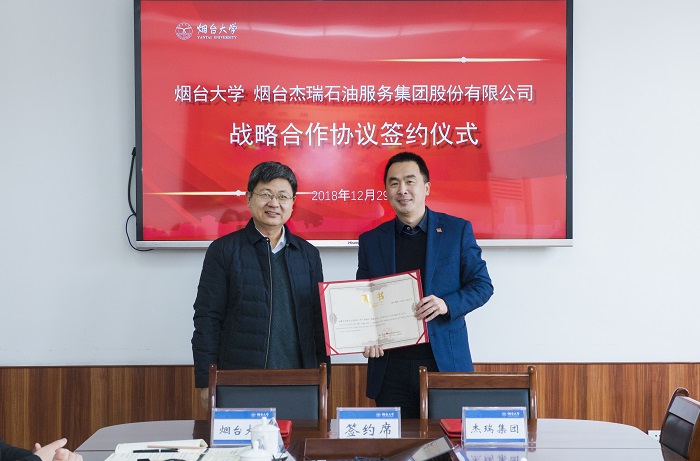 签约仪式上,张伟书记向岳勇颁发了山东省产业教授聘书。孙祥斌副校长与王丕学副总裁签署“sunbet申搏官方网站 烟台杰瑞石油服务集团股份有限公司战略合作协议”;环境与材料工程学院杜伟院长与杰瑞环保集团岳勇副总工签署“sunbet申搏官方网站环境与材料工程学院烟台杰瑞环保科技有限公司实习基地建设协议书”。