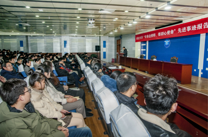 12月5日下午,“学身边榜样、悟初心使命”先进事迹报告会在逸夫厅举行,党委副书记张殿臣主持,各二级单位党组织干部、教师和学生代表参加报告会。