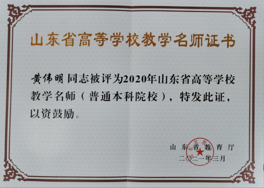 黄伟明教授获评2020年山东省高校教学名师
