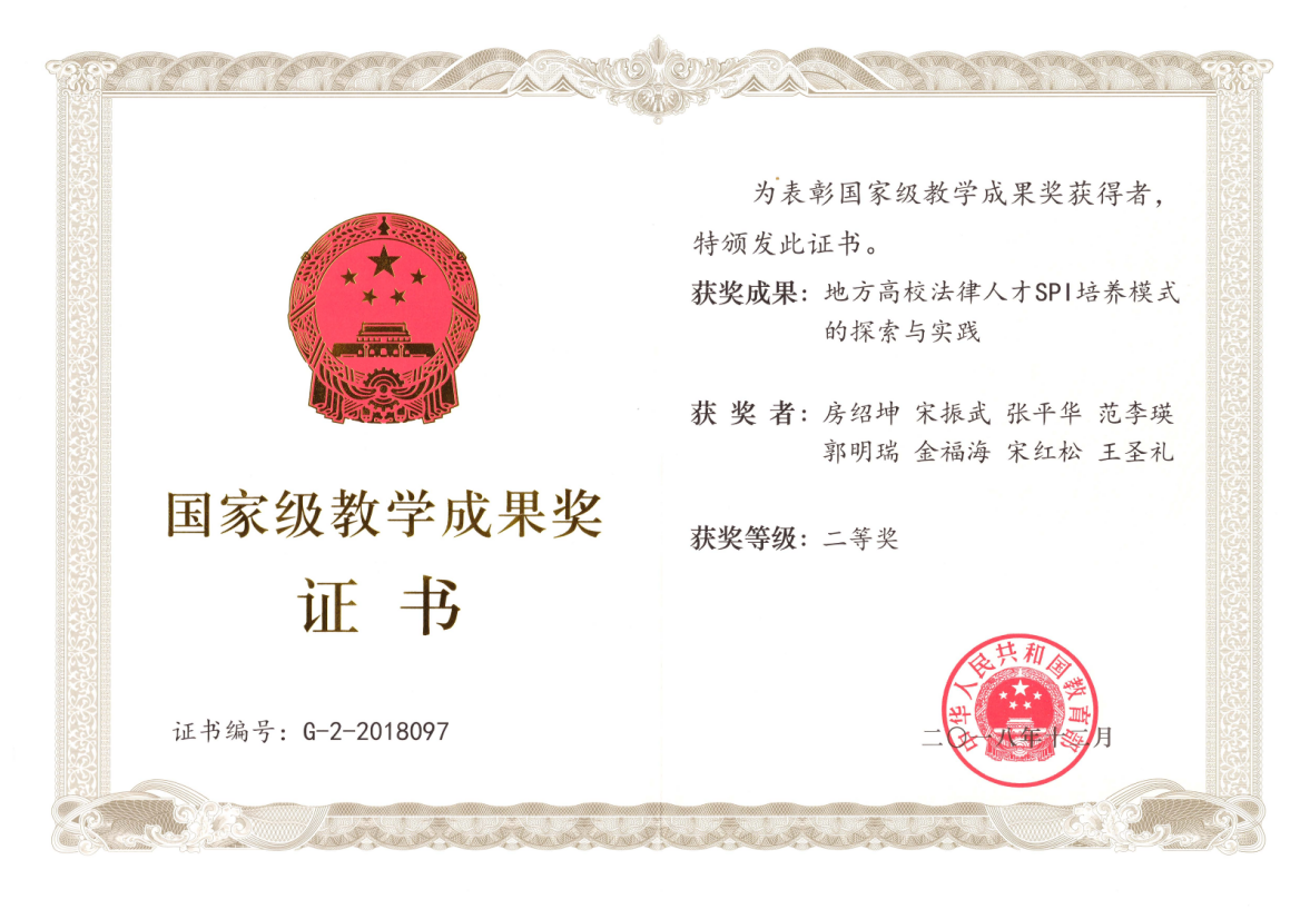 房绍坤教授、宋振武教授等负责的教学成果《地方高校法律人才SPI培养模式的探索与实践》获国家级教学成果奖二等奖