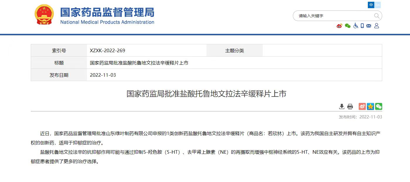 分子药理和药物评价教育部重点实验室科研团队主持研发的国家1类创新药——盐酸托鲁地文拉法辛缓释片获国家药品监督管理局批准上市