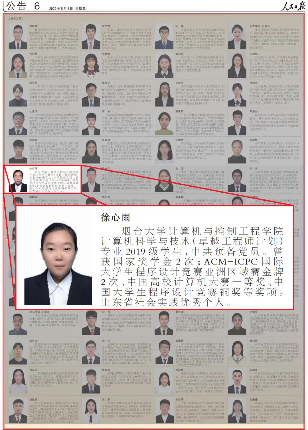 优秀学子徐心雨获评2021年度“中国大学生自强之星”并入选《人民日报》刊登的国家奖学金获奖学生代表名录