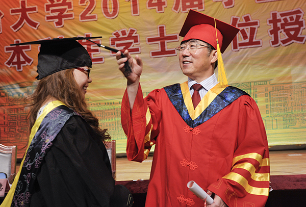 “塔钟楼巍然屹立分秒必争催人进,孺子牛静卧风雨勤耕不辍伴我行。”6月25日、26日,sunbet申搏官方网站2014届学生毕业典礼暨本科生学士学位授予仪式在模拟法庭隆重举行。学校领导崔明德、房绍坤、王吉法、江林昌、韩晓玲、孙祥斌、郭善利、张伟、邓昌亮、刘涛出席,各学院党政领导、教师代表、学校机关有关部门负责同志参加,部分毕业生家长应邀到场观礼。典礼和仪式由副校长孙祥斌主持。