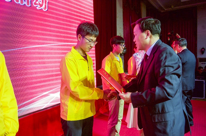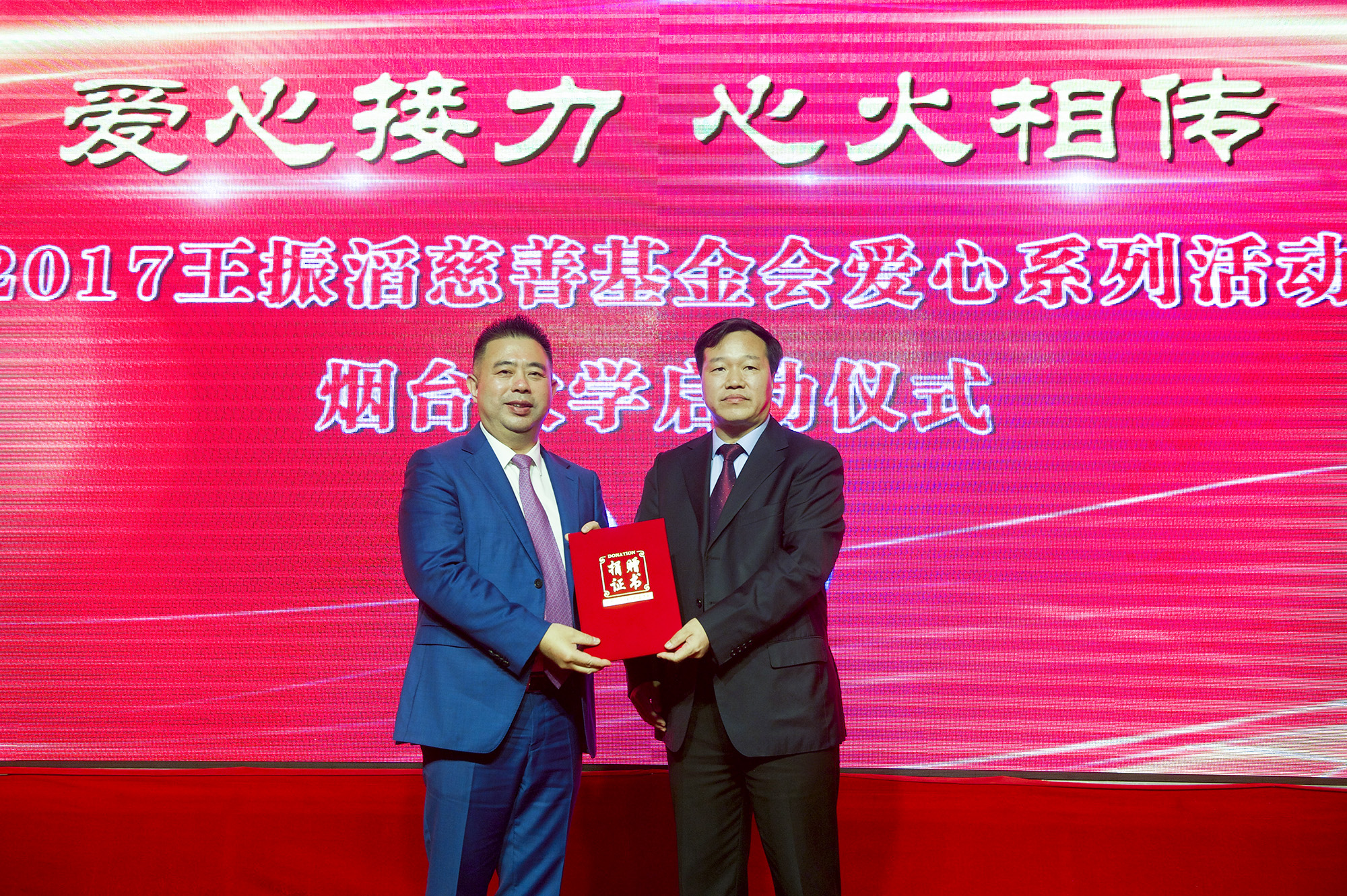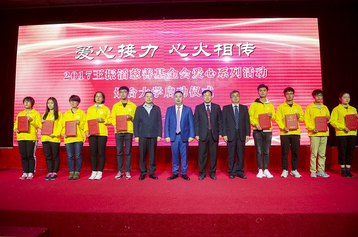 随后,郭校长代表学校接受基金会100万元爱心基金,并向王振滔慈善基金会颁发捐赠证书。与会领导为爱心接力手代表颁发了每人5000元的助学金。