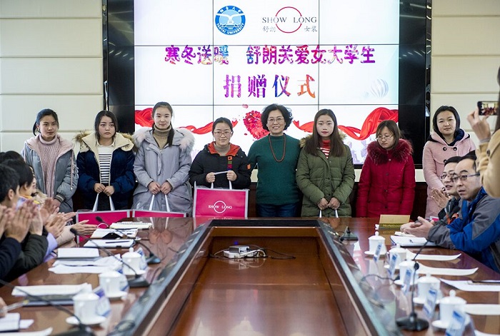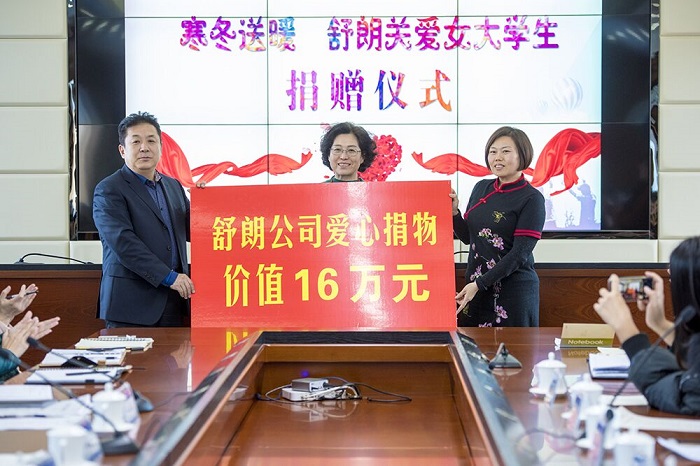 孙祥斌代表学校接受舒朗公司16万元爱心捐物,李蒙女士向受助女生代表捐赠衣物。人文学院熊辉源同学代表全体受助学生发言,表示将勇敢面对生活的磨难,努力学习,奋发成才。舒朗公司董事、副总经理李蒙分享了做公益事业的收获和感悟,勉励学子不忘初心、积极学习,培养阳光心态,成就舒朗人生。