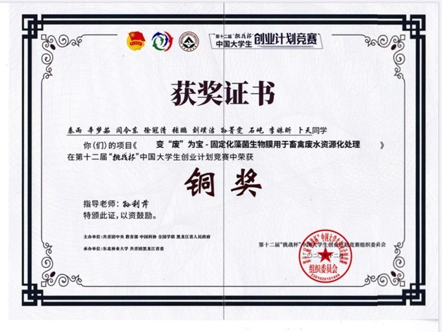 学院《变“废”为宝-固定化藻菌生物膜用于畜禽废水资源化处理》项目获得第十二届挑战杯竞赛铜奖
