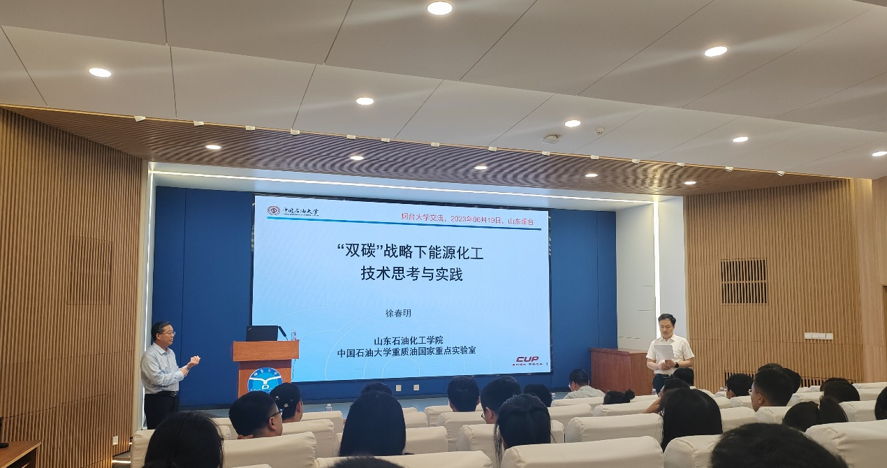 访问期间,徐春明院士作了题为《“双碳”战略下能源化工发展思考与实践》的学术报告,重点围绕“碳达峰、碳中和”国家战略目标,深刻分析石油化工学科与行业的发展趋势,详细介绍绿氢、绿电、储能等领域科技进展情况。化学化工学院百余名师生参加报告会。