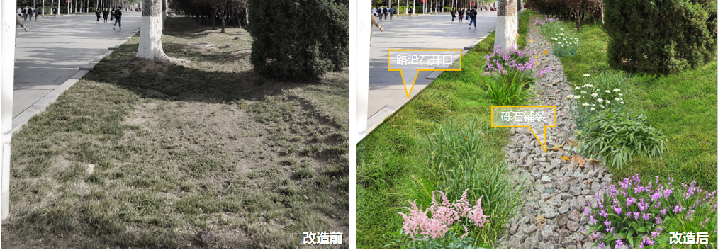 “北校区(主校区)建于上世纪八十年代,校园内人行道、广场、停车场均采用不透水铺装,雨水主要通过地表径流排放。”后勤管理处工作人员介绍道。然而,由于校园地势平坦,且不透水的路面阻碍了雨水的下渗,因此暴雨天气局部容易出现内涝现象。“只有做到下雨时吸水、蓄水、渗水、净水,需要时将蓄存的水释放并加以利用,才能实现雨水自由迁移。”工作人员表示。基于这样一个理念,本项目将海绵城市元素与校园设计相融合,采用透水铺装对校园原有的部分铺装进行改造,并新建下凹绿地及雨水花园,优化了校园与周边雨水系统的衔接,实现雨水资源化利用,在相当程度上缓解暴雨时校园内涝现状。
