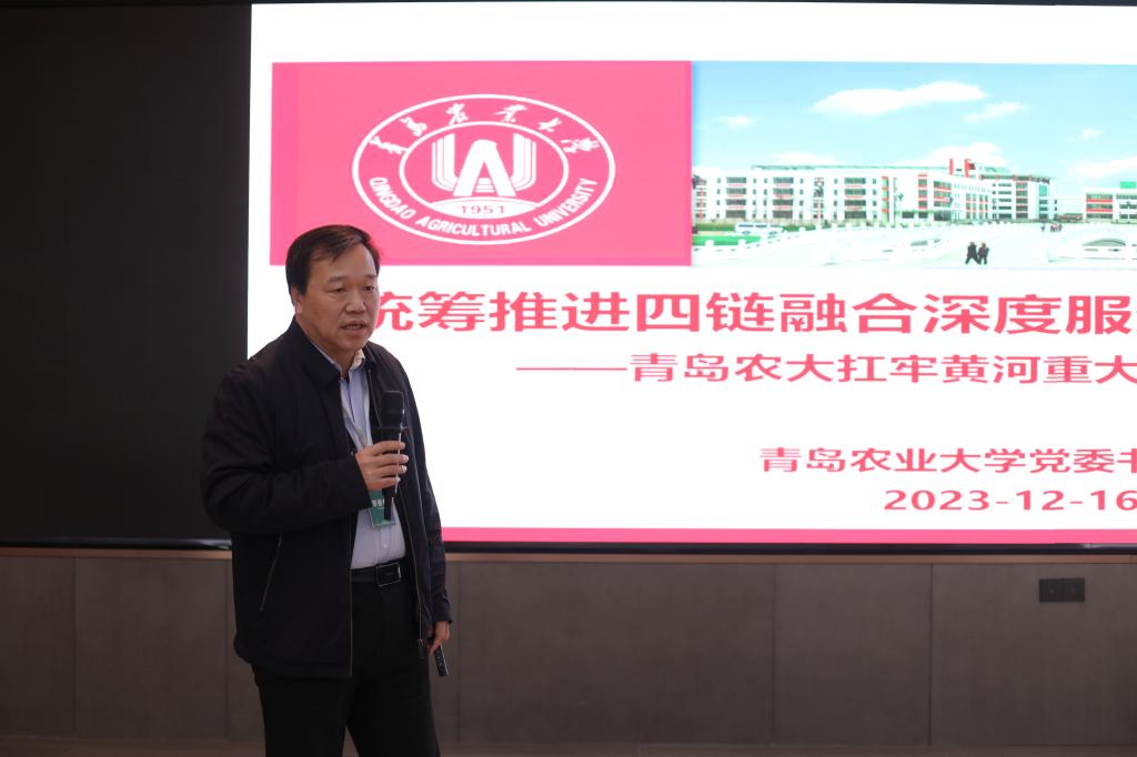 青岛农业大学党委书记郭善利教授作《统筹推进四链融合深度服务黄河重大国家战略——青岛农大扛牢黄河重大国家战略的责任担当》主旨报告