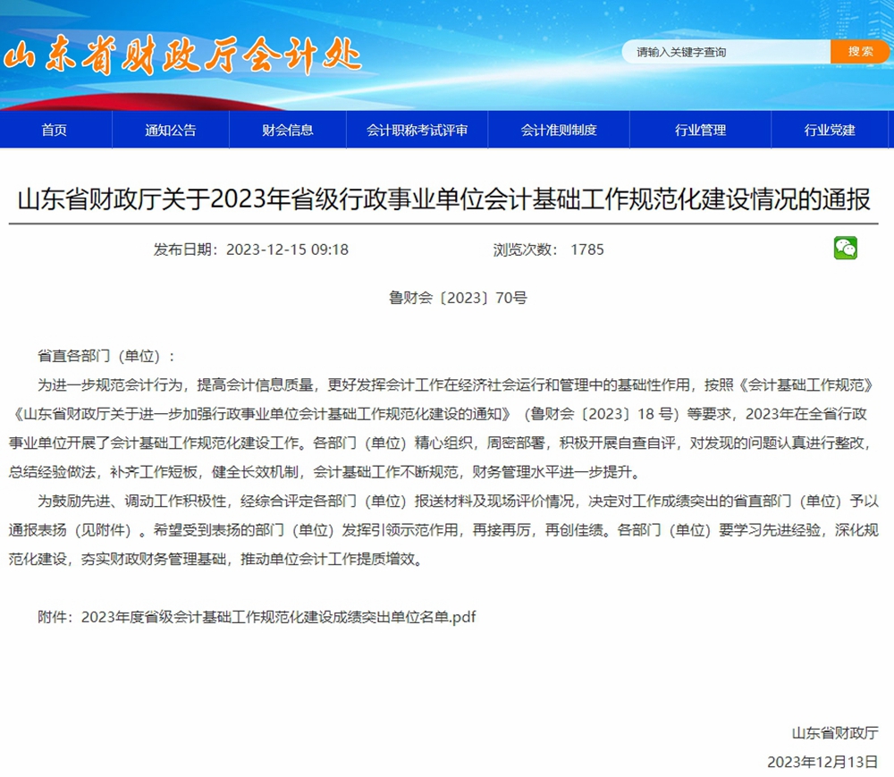 【本站讯】近日,山东省财政厅印发《关于2023年省级行政事业单位会计基础工作规范化建设情况的通报》(鲁财会〔2023〕70号),对2023年全省行政事业单位会计基础工作规范化建设工作突出单位通报表彰,sunbet申搏官方网站获评“2023年度省级会计基础工作规范化建设成绩突出单位”。