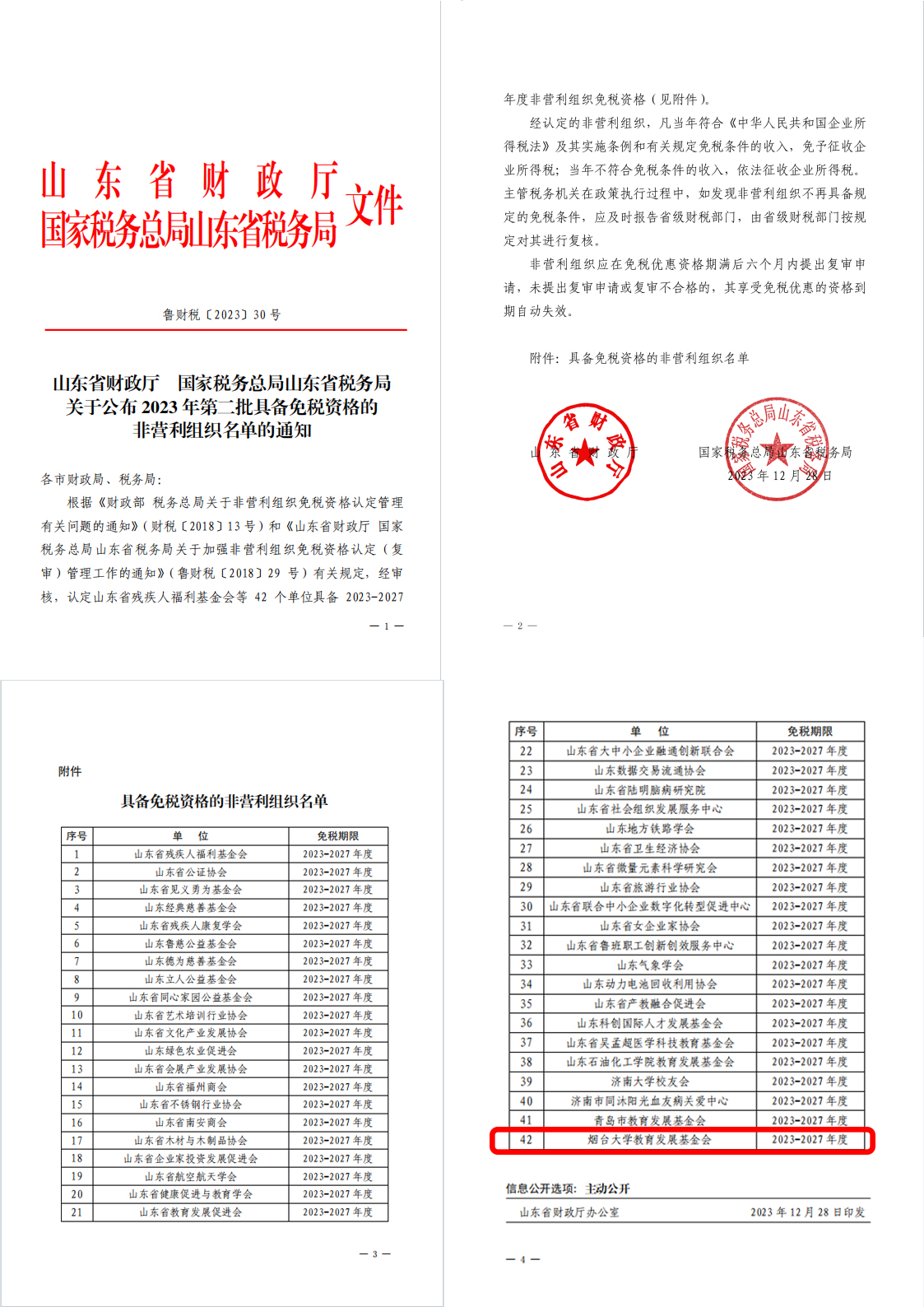 【本站讯】近日,山东省财政厅、国家税务总局山东省税务局发布的《关于公布2023年具备免税资格的非营利组织名单的通知》(鲁财税〔2023〕30号),sunbet申搏官方网站教育发展基金会获得2023年度-2027年度非营利组织免税资格。山东省财政厅、国家税务总局山东省税务局、山东省民政厅发布的《关于2023年度—2025年度公益性社会组织捐赠税前扣除资格等有关名单的公告》(鲁财税〔2023〕34号),sunbet申搏官方网站教育发展基金会获得2023年度-2025年度公益性捐赠税前扣除资格。