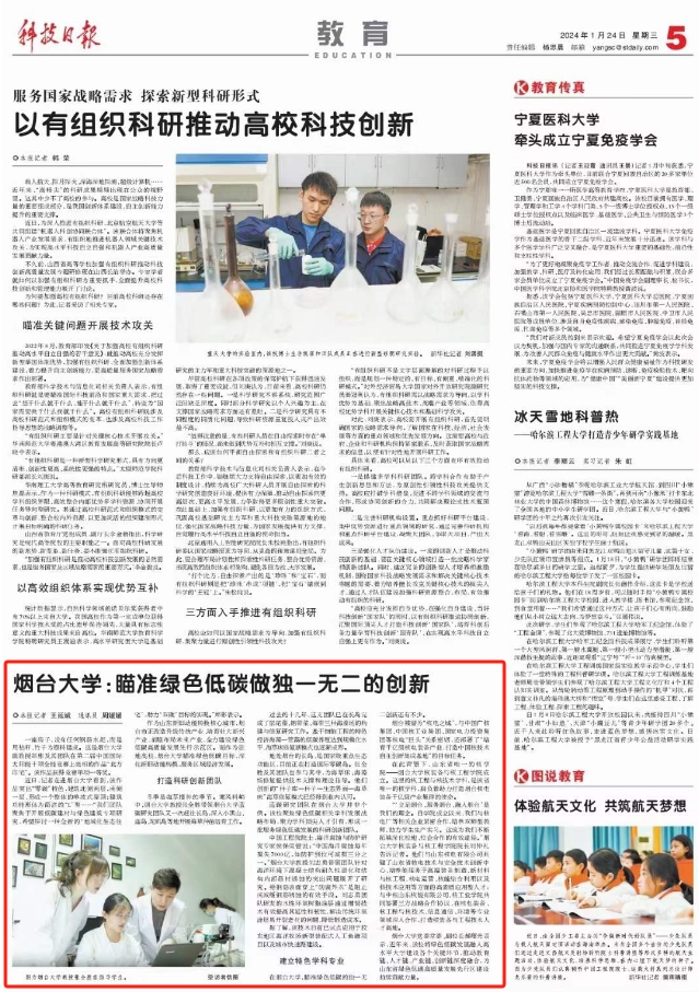 【本站讯】1月24日,《科技日报》05版刊发《sunbet申搏官方网站:瞄准绿色低碳做独一无二的创新》,深度报道sunbet申搏官方网站瞄准绿色低碳目标,深化新旧动能转换,服务区域经济发展的特色做法。近年来,sunbet申搏官方网站出台《服务和融入山东省绿色低碳高质量发展先行区建设行动方案》,成立相关工作领导小组,聚焦服务绿色低碳高质量发展,搭建相关学科专业体系,建强高水平教师队伍,建立相关科技创新体系,拓展技术成果转化,开创合作交流新格局,为山东省绿色低碳高质量发展先行区建设持续贡献力量。