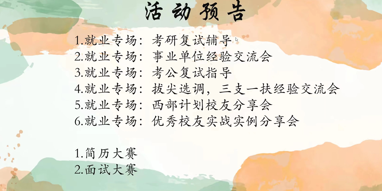 各学院开展“就业育人”主题教育系列活动,助力毕业生提升实践能力。文学与新闻传播学院本科生李雅楠在学院“简历大赛”线上活动中获得一等奖,“原来简历制作水平的高低对于求职能否成功这么关键!在老师们的精心指导下,我才知道想象中的简历和实际求职时所需要的简历差别有多大。”李雅楠感叹道。物理与电子信息学院组织开展“考研如何一击而中”专家讲坛、“成‘公’有你‘编’织未来”考公考编指导讲座,邀请专业课教师、公考指导教师为学生排忧解惑,增强毕业生考研、考公信心与就业能力,提升竞争内驱力。
