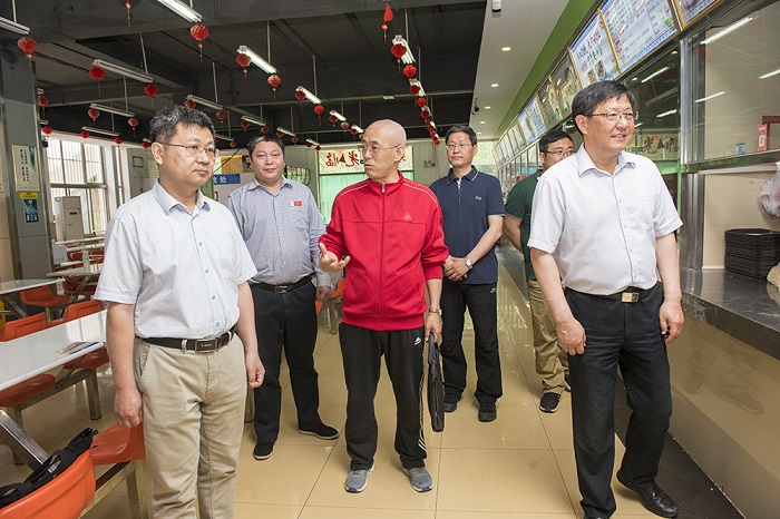 在学生餐厅,学校领导仔细查看了后厨、库房以及餐具消毒系统,详细询问了各个餐厅的消防及卫生情况、餐厅员工的住宿生活情况。在保卫处,学校领导实地查看了校园监控系统、校园交通秩序疏导整顿情况和消防管理工作,并详细了解人脸识别技术的应用、报警点改建等具体问题。在听取有关部门的现场汇报后,张伟指出,校园安全工作要常抓不懈,持续保持高度警觉,要时刻绷紧安全这根弦,居安思危、未雨绸缪;相关单位要进一步从细节入手,分领域、分区域查找风险点,按节点、按重点排查隐患;要充分认识当前安全稳定领域面临的风险挑战,以高度的政治责任感和强烈使命感做好校园的后勤保障和安全保卫工作,为学校的改革发展创造良好环境。