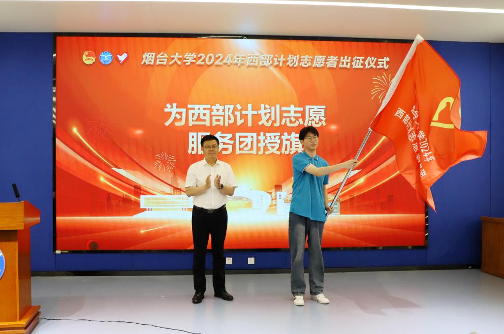 卢国强为2024年西部计划志愿服务团授旗。姚昌为西部计划志愿者代表颁发绶带。经济管理学院2020级本科生韩宇航、土木工程学院2021级研究生吴玥代表2024年西部计划志愿者依次发言。志愿者们用冲锋在前、投身西部的决心,践行了奉献祖国、实现自我的青春誓言。