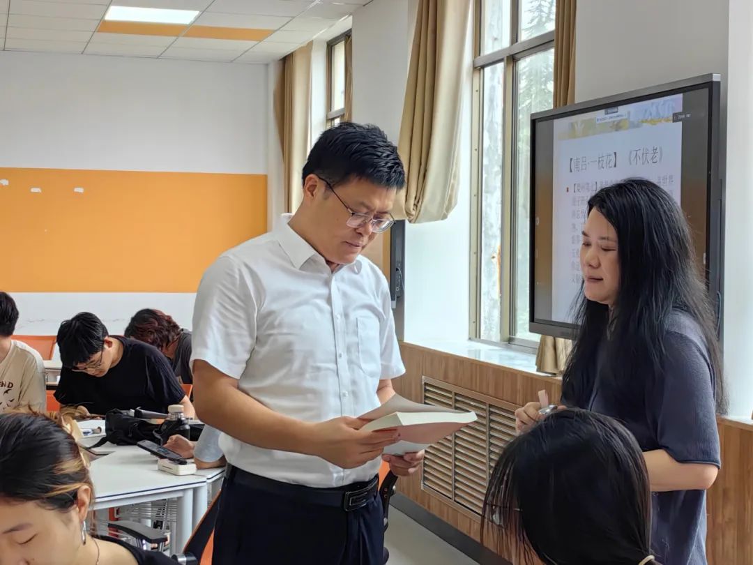 听课过程中,学校领导认真旁听、细致记录,从教师授课情况和学生学习情况两个方面进行全面评价。课后,学校领导与任课教师深入交流,就教学细节提出改进建议,共同探讨了教学创新的路径,鼓励教师持续优化课程设计,提升课件质量,实现价值引领、知识传授与能力培养的有机结合。