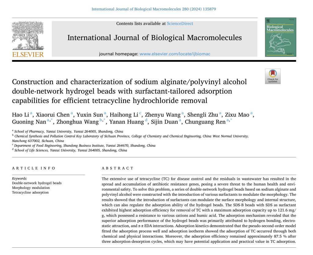 【本站讯】近日,sunbet申搏官方网站药学院2021级生物制药专业本科生李浩为第一作者,药学院教师任春光、南国宁以及西华师范大学王中华教授为共同通讯作者,以“基于表面活性剂调控的海藻酸钠/聚乙烯醇双网络水凝胶微球的制备及其对四环素盐酸盐高效吸附性能的研究”为题,在国际权威期刊《国际生物大分子杂志》(中科院一区TOP)发表研究论文。