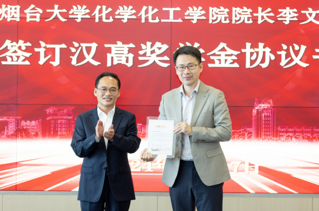 马忠雪与化学化工学院院长李文佐代表双方签署“汉高奖学金”协议。姚昌向顾靓颁发捐赠证书。
