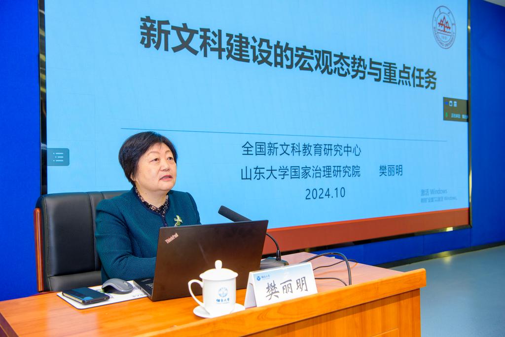 研讨会上,樊丽明作《新文科建设的宏观态势与重点任务》主题报告。报告深入分析了新文科建设的宏观态势,解答了“什么是新文科”“为什么建设新文科”“怎样建设新文科”等核心问题,介绍了全国各高校推动新文科实践创新和理论创新的重要举措和标志性成果。她以教育强国建设为目标,基于当前科技革命形势和社会发展需求,阐明了未来新文科建设的重点任务,并提出了构建中国自主人才培养体系的路径和方法。