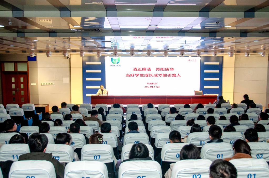 会议指出,辅导员是学生日常思想政治教育和管理工作的组织者、实施者和指导者,是学生的人生导师和知心朋友,加强辅导员廉政建设是辅导员成长需要、履职所需,是学生工作高质量发展的必然要求。会议强调,广大学工干部要自觉锤炼政治能力,坚持为党育人、为国育才的初心使命,着力培养德智体美劳全面发展的社会主义建设者和接班人。要增强廉洁意识,以廉润心,以案为鉴,始终保持敬畏,不断涵养道德情操。要强化担当作为,以廉促干,以廉促行,明确职责要求,狠抓工作落实,不断开创工作新局面。要扛牢全面从严治党政治责任,把学生工作放到学校事业发展大局、新时代全面从严治党大势中谋划部署、推动落实,坚守廉洁底线,积极对标对表,努力建设一支忠诚、干净、担当的辅导员队伍,为学生健康成长成才和学校事业高质量发展作出新的更大贡献。