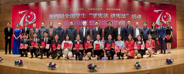 首轮比赛于14日上午在韶乐厅和综合楼624会议室同时举行,选手们围绕树立宪法精神、坚守法治信仰开展主题演讲,最终有16名选手突破重围,进入到决赛环节。决赛于14日下午在韶乐厅举行。山东大学(威海)法学院院长、山东省宪法学研究会会长、国家社会科学研究重大课题首席专家肖金明,原烟台市中级人民法院党组成员、专职审委会委员孙永权,滨州医学院马克思主义学院教授尹吉成,烟台日报执行总编辑马全应,烟台广播电视台新闻专题部主任,山东省十佳栏目《烟台故事》栏目制片人、主持人崔海鹰担任此次高校组决赛的评委。自赛事启动以来,全省各地市、各高校积极响应,广泛动员参加。决赛过程中,选手们结合实际,畅谈自己对宪法的学习感悟,以主题鲜明、情感真挚、思维敏捷、表达精彩的演讲表现,赢得了评委老师们的高度评价,这也体现出“学宪法 讲宪法”活动在广大青年之间取得了良好成效。比赛结束后,评委肖金明教授说:“难能可贵的是每一位选手不仅了解新中国宪法历史的发展,对宪法的实践也是比较熟悉的,选手们运用了典型案例,充实了内容,使得演讲变得非常生动。也希望选手们能在日常生活中向身边的人宣传宪法,营造学习宪法知识、弘扬宪法精神的浓厚氛围。”