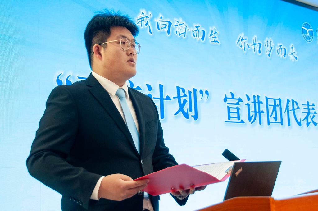 随后,校团委书记张岩对“引航计划”筹备情况和实践活动方案作了介绍。“引航计划”宣讲团代表、机电汽车工程学院学生袁庆鹏发出“追逐光、成为光、散发光”的青春倡议。“引航计划”宣讲团代表、物理与电子信息学院学生苏振宇结合宣讲材料和个人成长经历进行现场路演。