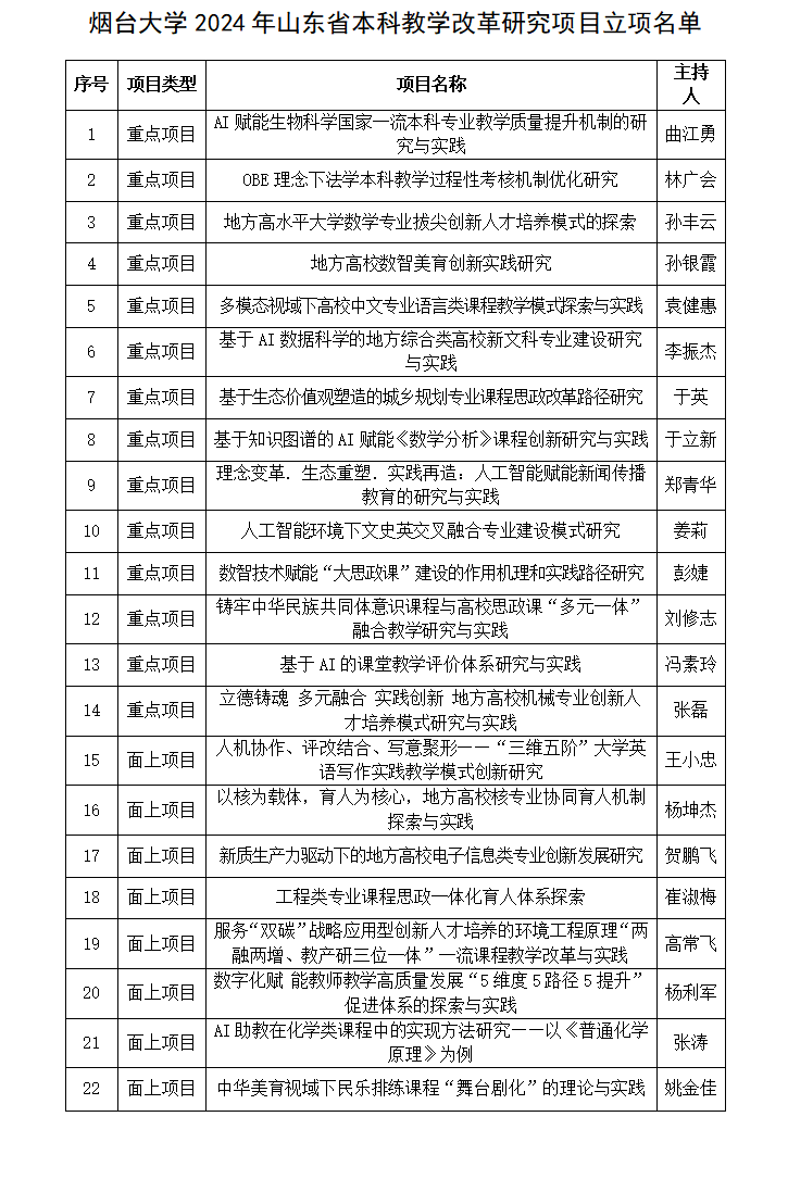 【本站讯】近日,山东省教育厅公布了2024年本科教学改革研究项目立项名单,sunbet申搏官方网站获批22项,其中重点项目14项、面上项目8项,立项数量再创新高,位居省属高校前列。这是学校坚持不懈抓教育教学、不断进行理论与实践探索的结果,也是学校高度重视人才培养、狠抓专业内涵建设、努力提升人才培养质量的集中体现。