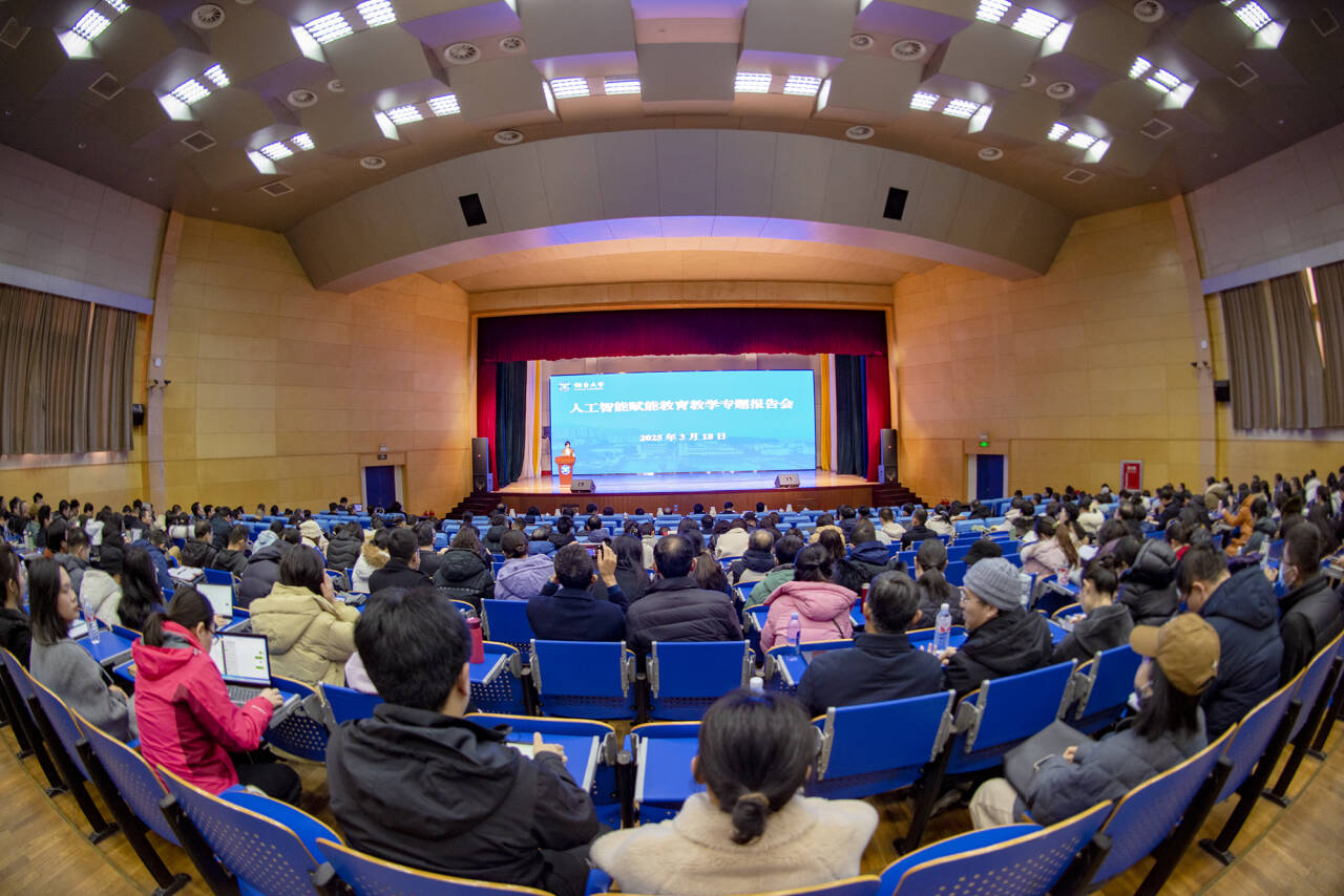 【本站讯】3月18日上午,学校举办人工智能赋能教育教学专题报告会。中国人工智能学会理事、浙江工业大学计算机科学与技术学院王万良教授,超星集团未来研究院高级研究员张杰主任分别作报告。学校领导、各相关职能部门负责人、各学院负责人和一线教师近600人参加报告会。报告会由党委常委、副校长冯素玲主持。