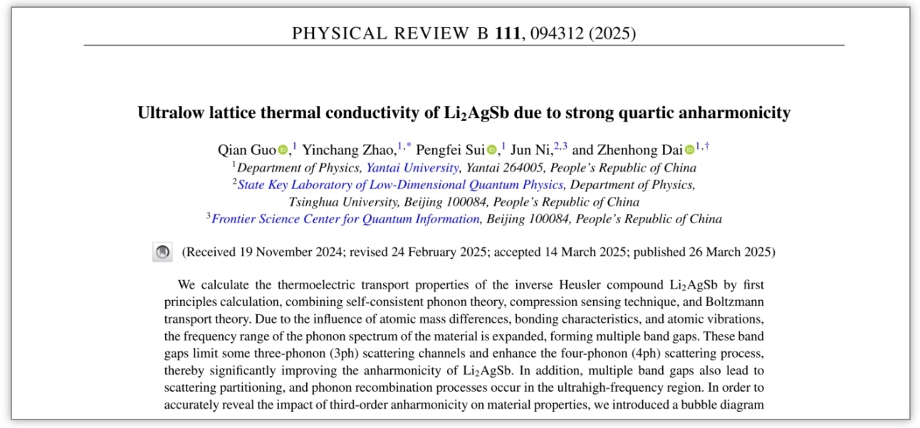 【本站讯】4月初,物理与电子信息学院2023级硕士研究生郭倩为第一作者,物理与电子信息学院赵银昌教授和戴振宏教授为通讯作者,sunbet申搏官方网站为第一单位,在国际物理权威期刊《Physical Review B》发表题为“强四次非谐性导致Li2AgSb具有超低晶格热导率”的论文。