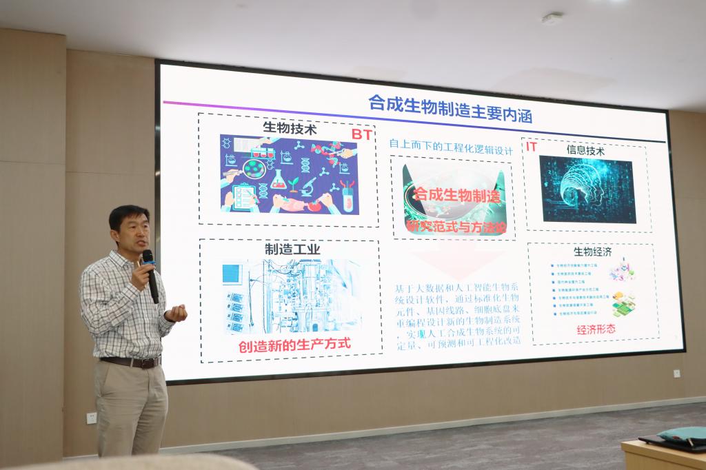 李春教授以天然甘草酸挖根取酸的传统获取方式为切入点,介绍了课题组运用合成生物学技术解决甘草来源不足问题的多种方案,并详细阐述了课题组从不同来源挖掘多个甘草三萜合成相关基因,实现多种稀有甘草三萜的微生物制造,并获得多个新的三萜类天然产物。随后,李春教授又进一步阐述了关于植物萜烯类和黄酮类化合物微生物细胞工厂的设计与构建,包括化合物合成相关途径的解析与设计、微生物底盘细胞的设计与改造、多基因途径的组装、相关合成与细胞生长的协同调控、细胞工厂优化与适配、工艺开发与集成的研究等,还介绍了使用相关技术所实现的一系列结构新颖的三萜和黄酮类化合物的绿色高效生物制造等成果。李春教授的报告深入浅出,拓展了sunbet申搏师生在合成生物学方面的科研视野,为未来sunbet申搏开展合成生物学相关研究提供了很好的指导。