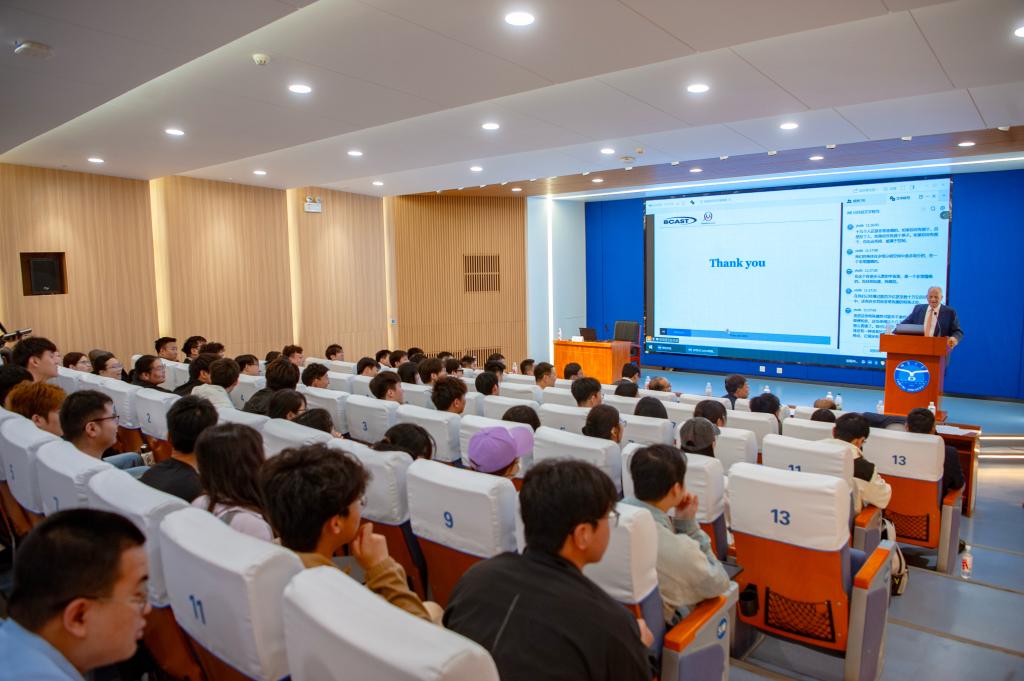 来校期间,布莱恩·康托教授为材料学科师生带来一场题为“Multicomponent High-Entropy Cantor Alloys”(多组元Cantor高熵合金)的精彩学术报告,回顾了材料科学的发展脉络,指出人类文明的进程可以视为不断发现新合金、开发新材料的历史。他系统介绍了多组元高熵合金,特别是其本人发现的Cantor合金体系的起源、发展过程及其独特的物理与化学性质。最后,布莱恩·康托教授以一个富有趣味性的化学问题幽默收尾。报告内容深入浅出、引人入胜,赢得了全场师生的热烈掌声。