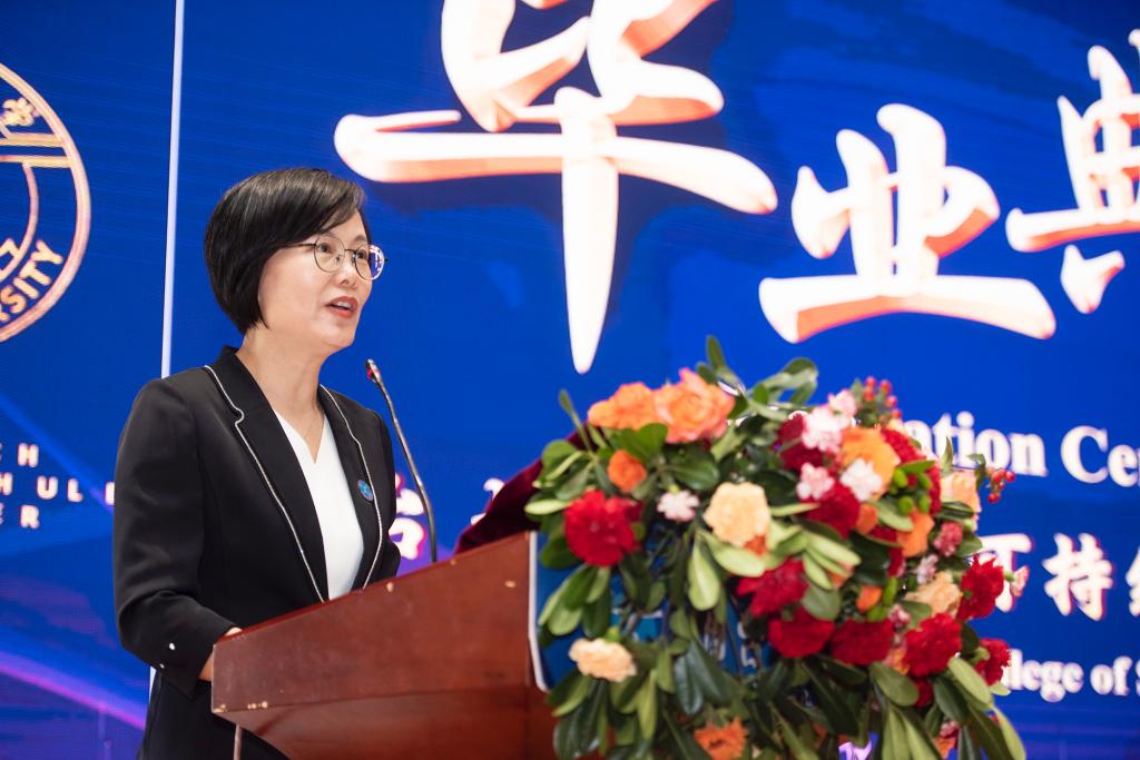 本次典礼以“初心·启航—砺行·硕果—致远·星辰”为主线。郝曙光向学院2025届毕业生致以衷心祝贺,勉励同学们以创新精神开辟可持续发展新航道,以责任担当坚守地球公民价值观,以开放合作推动人类命运共同体建设,努力成长为具有全球视野的可持续发展创新人才。Dorit Schumann指出,中德合作办学模式下培养的跨文化视野、创新思维和可持续发展理念,将成为毕业生应对未来挑战的独特优势,期待他们以自信的姿态踏上新征程,将知识和能力运用到推动全球可持续发展的实践中去。