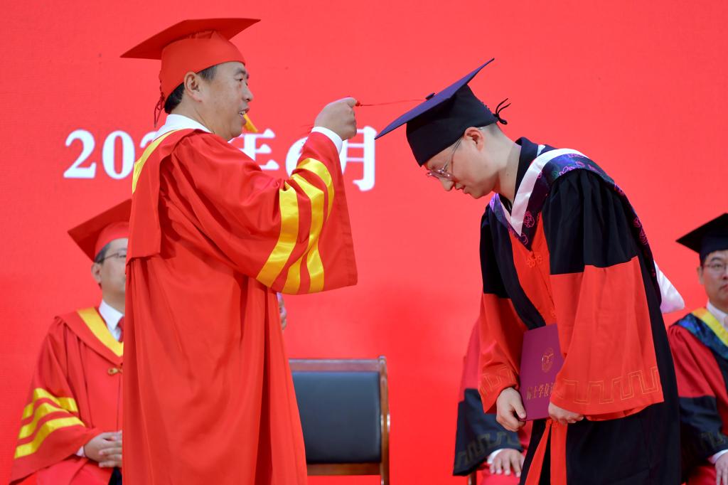 随后,学校举行了庄重的学位授予仪式。校长、校学位评定委员会主席郝曙光为毕业生博士研究生、硕士研究生逐一颁发学位证书,拨穗正冠,握手祝福并合影留念。