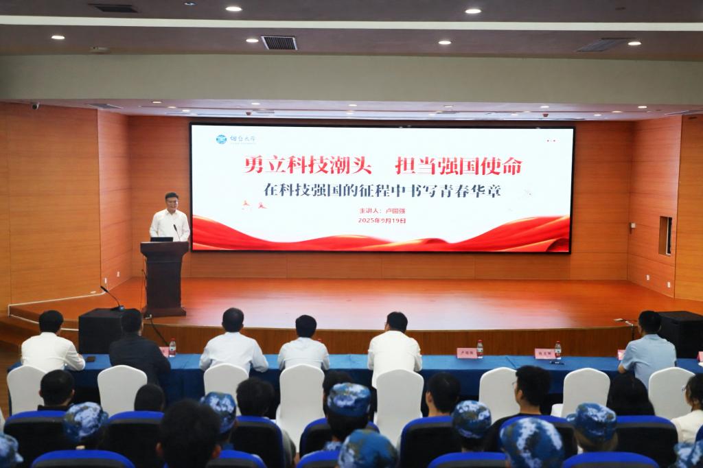 卢国强围绕“科技强国”时代命题,从“时代召唤:深刻把握科技强国的战略意义”“地方实践:真切感受科技创新的澎湃动力”“勇立潮头:积极践行当代青年的使命担当”三个部分展开授课,用鲜活的案例、生动的语言,引导新生将个人青春梦想融入国家发展的浩荡洪流。