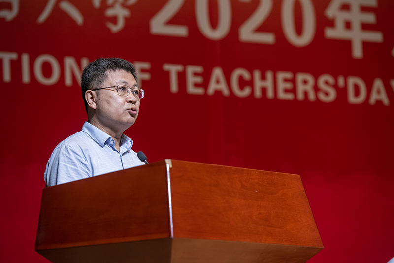 会上,2020年度优秀教师代表、计算机与控制工程学院贺利坚,优秀教育工作者代表、机电汽车工程学院杨清霞,在教育服务岗位工作满30年教师代表、音乐舞蹈学院舒星虹,新入职专任教师代表、数学与信息科学学院李凯强依次作了发言。