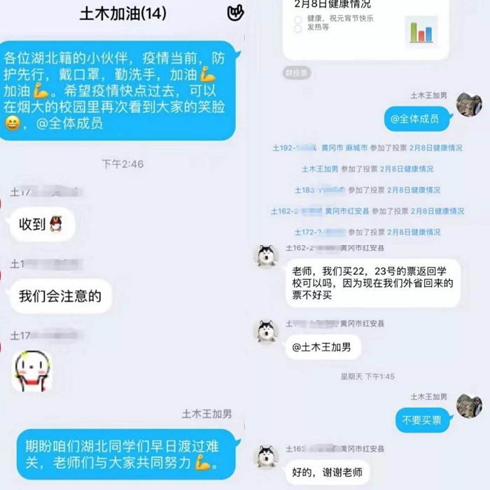 校园里有繁忙的身影,看不见的地方也有默默工作的人们。就像这安静的校园,既要有保安人员的“严防死守”,也还要辅导员、班主任的“苦口婆心”。学校启动疫情防控方案以来,各学院辅导员的每天第一事就是通过各种方式落实学生的情况:身体怎么样,是不是被隔离?一遍遍的探知最新居家情况,一遍遍的通知不要提前返校、一遍遍的告知研学注意事项。学校的229名湖北籍学生,每天都能得到来自学校的关心和问候。相对于暑假,一般来说寒假真的是“假期”,但今年的寒假在疫情爆发的那一刻就已经结束。国际教育交流学院的荆康宁老师,疫情防控工作不仅要面对本科生,还要面对留学生,刚开始下通知的时候,如何既真实告知疫情严重程度,又不使留学生产生恐慌情绪,着实令她费了一番头脑。土木工程学院的王加男老师,面对自己学院11名湖北籍学生组织的微信群,既要了解真实情况,还要加油鼓劲,十多天下来也有些“词穷”了。