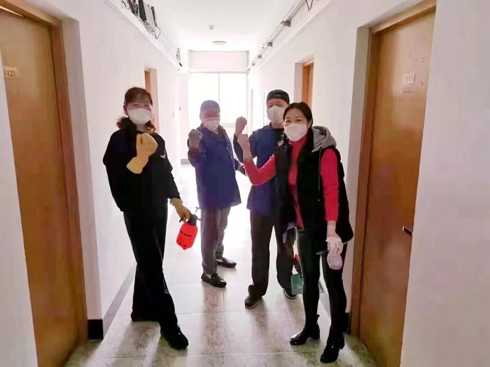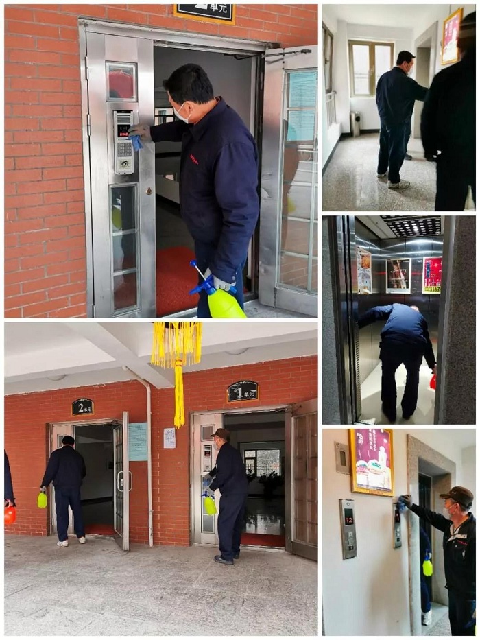 这安静祥和背后,忙碌的人还有很多,知道的、不知道的,看得见的、看不见的。物业中心的林玉信老师,每天带领12名队员进行85个单元、28个电梯间的消杀工作。40斤的喷桶,448层的攀爬——这是守土有责、责任在肩。
