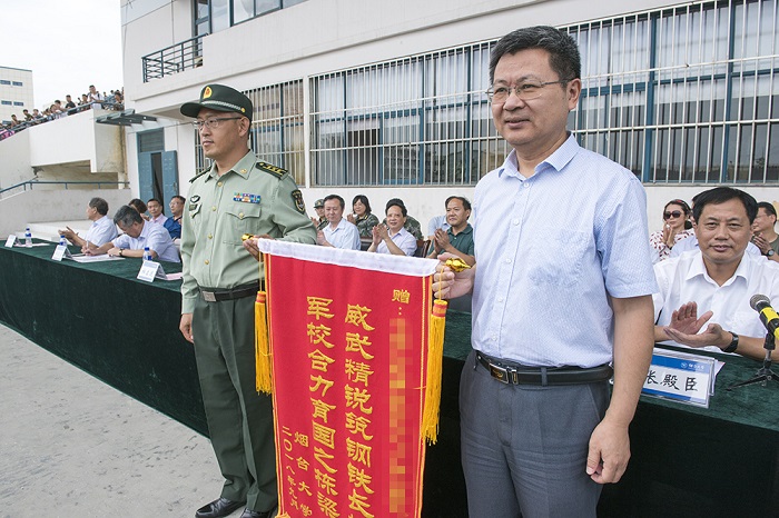 党委书记张伟向承训部队赠送“威武精锐筑钢铁长城 军校合力育国之栋梁”的锦旗。