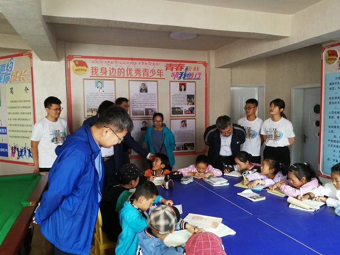 在贵南县,张伟一行走进团县委“青年之家”辅导站,实地察看同学们现场授课,现场检验支教队员的教学效果。当日,队员们向当地小学生讲授语文、历史、地理、数学、英语等内容,组织知识竞答大赛、趣味运动会、防火防震安全教育知识讲座等素质拓展活动。张伟与支教队员现场交流,在参观过程中逐一询问并悉心指导,引导队员们进一步提升授课质量、开拓授课思路。在贵德县“尚书房”书屋,支教队员们分别围绕着“丝路新世界、青春中国梦”国家专项展开了丰富多彩的支教活动,宣讲国家“一带一路”倡议及国家各项方针政策。走访过程中,张伟对实践队员不惧艰苦参与实践以及深入西部地区基层一线的表现给予充分肯定。张伟指出,大学生社会实践是广大青年学生“受教育、长才干、做贡献”的有效途径,要积极响应国家号召,主动融入国家重大战略,结合自身所学,深入开展社会实践,要带着“情怀”、带着“思考”、带着“问题”、带着“虚心”深入一线,深入基层,真正使自己受到洗礼、受到教育,为西部发展、民族复兴贡献青春力量。