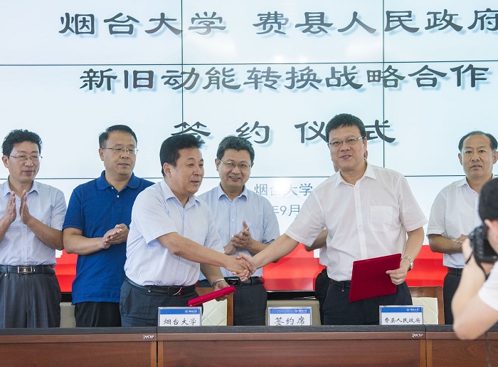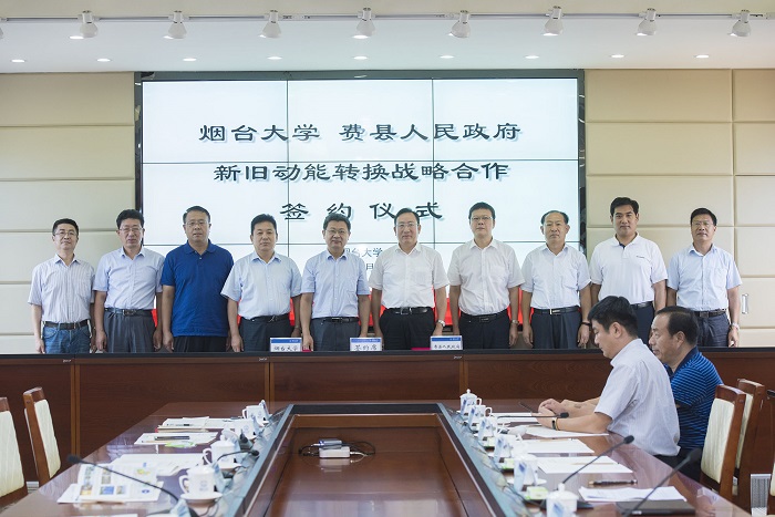 张伟代表学校对费县程守田、矫晓斌一行来访表示热烈欢迎,他简要介绍了学校的发展历程和办学特色,对费县近年来取得可喜成绩表示祝贺,希望双方今后在战略决策咨询、平台共建共享、科技成果转化以及助力产业发展等方面加强校地合作。程守田对学校的热情接待表示感谢,他介绍了费县的人文历史情况和产业情况,真诚欢迎学校在科技成果转化等方面与费县加强合作,费县将提供最好的投资环境和最优质的政策支持。孙祥斌和矫晓斌分别代表双方签订了新旧动能转换战略合作协议。
