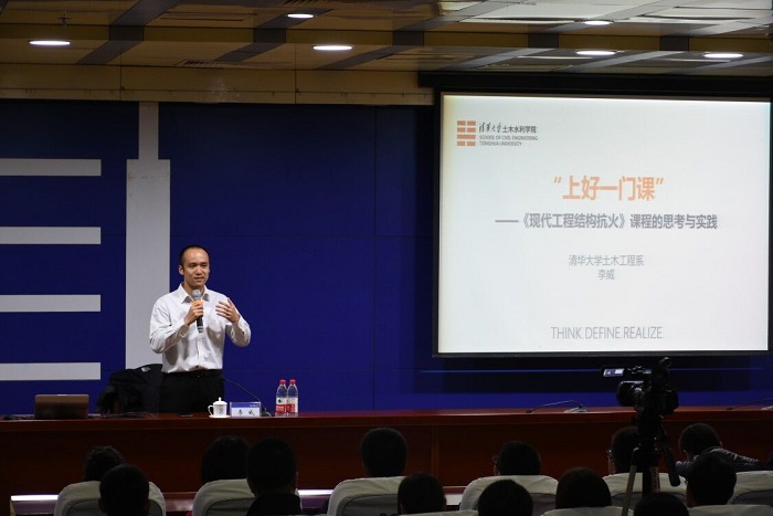报告会上,李威首先介绍了青教赛的基本情况,随后以自己讲授的《现代工程结构抗火》系统论述了“上好一门课”的功夫。“治课如烹小鲜”,李威强调了课程设计的重要性,分享了清华“三位一体”的教育理念,论述了价值塑造和课程思政与教学的日常融合,分析了教学和科研的关系,并与四位教师进行了交流互动。最后,李威还给全体教师上了一堂精彩的示范课。