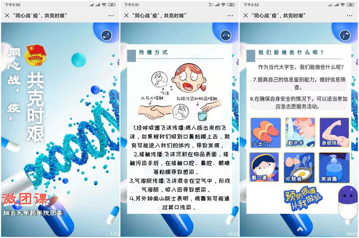 疫情发生后,经济管理学院充分运用新媒体平台宣传防疫知识,以微团课的形式,将学生的教育引导和防控工作通过线上做深做细。“细胞战斗实录——新冠肺炎被治愈的过程”“新冠肺炎12问你get到了吗”“这张卷子,你能得几分”“其实,你知道怎么做”“同学,你知道什么是气溶胶传播吗”……各类防疫小知识不仅扩展了师生的知识面,而且让大家明白了科学防疫的重要性。