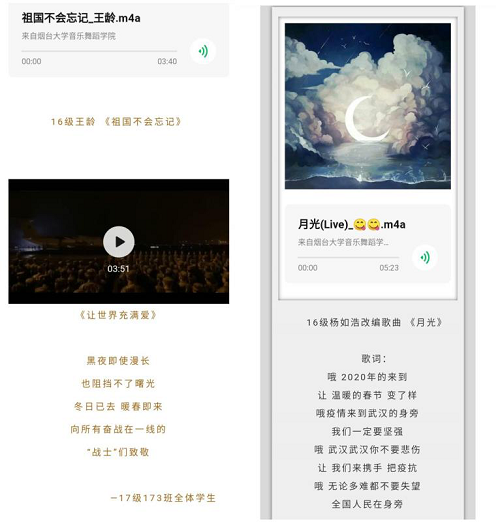 法学院学生陈嘉琦、张冉、曲珈慧将关怀与祝福写进歌中,原创歌曲《远距离拥抱爱》,为武汉加油,这是疫情发生之后,艺术驰援抗“疫”的又一首公益歌曲。创作灵感来自于一个画面:女儿来到医院给当医生的妈妈送饭,相见却不能相拥。隔着隔离区,女儿举起双臂隔空“拥抱”了妈妈,虽没有肢体上的接触,但母女两人的心却紧紧相连。《烟台晚报》对其创作始末进行了详细报道。